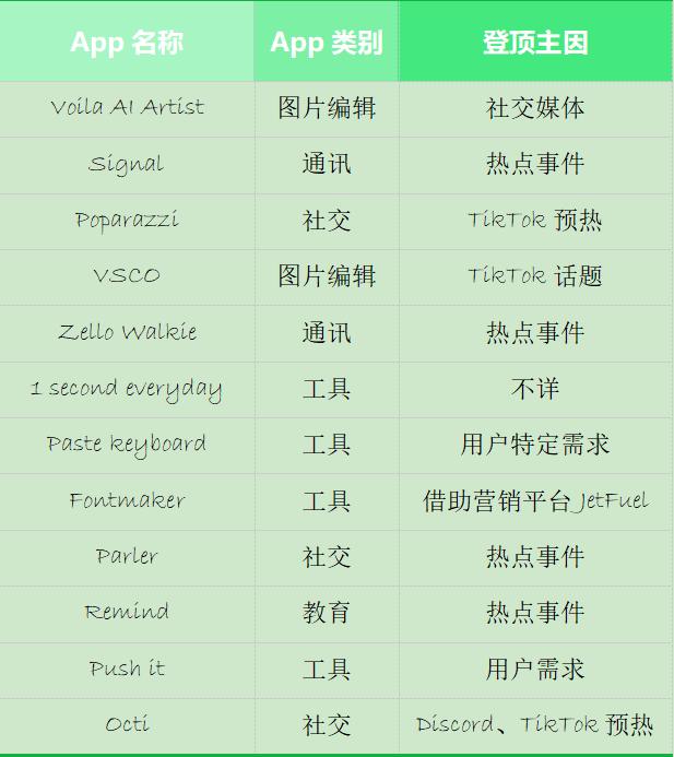 除此之外还有一类 App 完全是蹭热点登顶的,比如之前「Signal」的登顶跟 WhatsApp 的隐私政策变化和马斯克的呼吁有关,「Parler」的登顶与美国部分民众对特朗普的支持有关等等。情况差不多的还有一些登顶的大厂产品,例如「Oculus」登顶是因为圣诞节很多人都送了 VR 产品给家人作为礼物,顺带着这款 App 也就登顶了。这类产品的登顶偶然性太大对开发者而言没有很大的参考意义,但背后也暗含趋势,但本文就不再多说了。