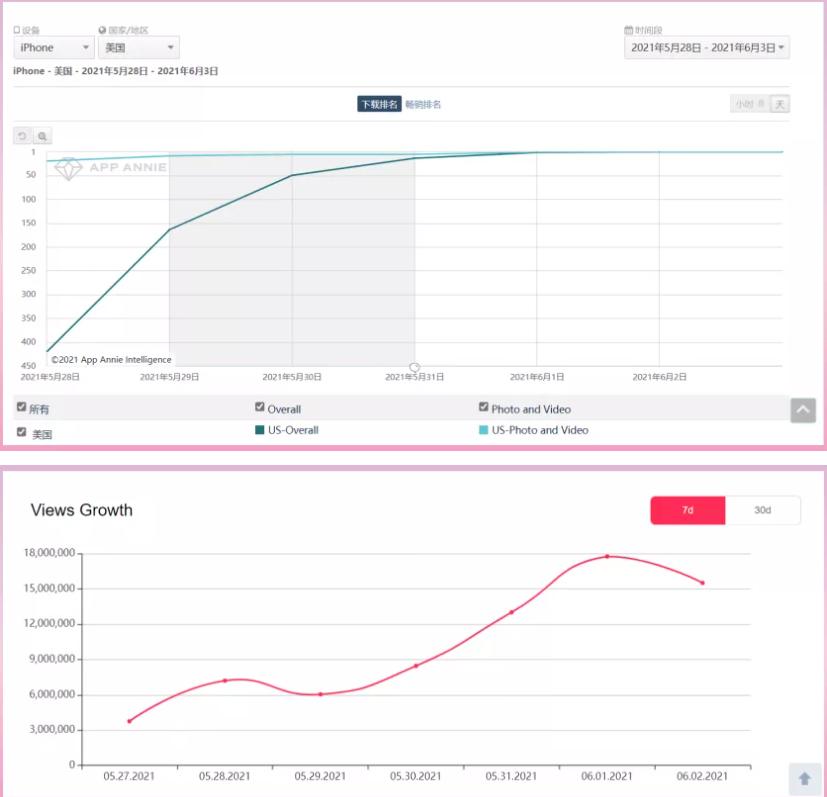 2021 年 6 月 VSCO 登顶后白鲸出海发布的《从登上美国 iOS 下载榜第一、月营收 300 万美元的产品,看修图 App 如何迎合用户最新需求》一文中提到,在 VSCO 登上榜首的那段时间前后几乎是 0 投放,同时 VSCO 在各个市场下载榜的排名增长曲线又几乎和 #VSCO 话题在 TikTok 上的播放量增长曲线重合,由此可以推断 VSCO 的下载排名上升与 TikTok 的 #VSCO 话题的播放量的增长有关系。
