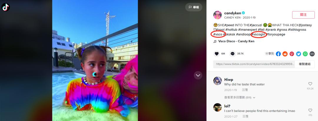 不过也令人纳闷的是,为什么 VSCO 的话题在 TikTok 有这么大的播放量?并且从榜单来看,除了排名第一位的 TikTok 以外,Top100 中只有 VSCO 这个话题是一个 App。然而在这个话题下我们发现用户并不是展示自己在 VSCO App 上的修图成果,而更多的是分享自己的生活。