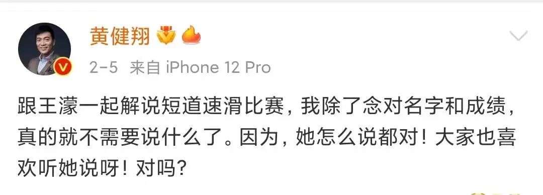 比赛规则、判罚问题,这些黄健翔也会询问王濛。在社交平台上,黄健翔也会积极和王濛互动:用“随身带尺那位”形容王濛;在解说足球场前,调侃道“王濛指导没来,我今天可以多说点”,更有网友建议王濛和黄健翔一起解说足球赛。