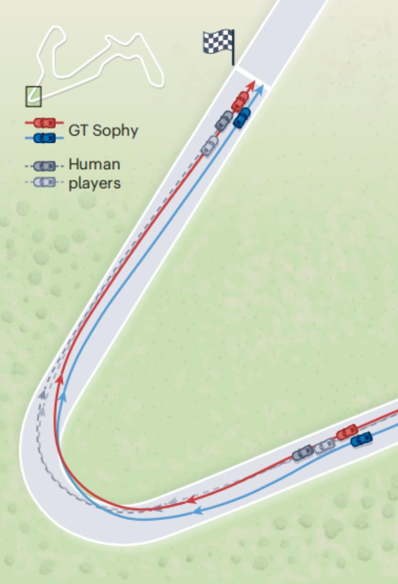 为了控制汽车,车手们对他们的车辆动力学和赛道的特性有详细的了解。在此基础上,驾驶者建立所需的战术技能,通过防守对手,执行精确的演习。同时,驾驶员必须遵守高度精炼但不精确的体育道德规则,最后,车手在模拟对手、决定何时以及如何尝试超车时,会运用战略思维。模拟赛车是一个需要在具有高度真实、复杂物理环境中进行实时、连续控制的领域,GT Sophy 在这种环境下的成功首次表明,在一系列汽车和赛道类型中,有可能训练出比顶尖人类赛车手更好的人工智能代理。这一结果可以被视为是计算机在国际象棋、围棋、冒险、扑克牌和星际争霸等竞争性任务持续发展的另一个重要步骤。