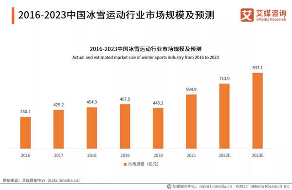 政策利好带来的冰雪市场规模的空前扩大。根据艾媒咨询发布的《2022年中国冰雪运动行业发展趋势报告》显示,2021年中国冰雪运动行业市场规模为594.9亿元,预计2022年将达到713.9亿元,保持稳定增长态势。