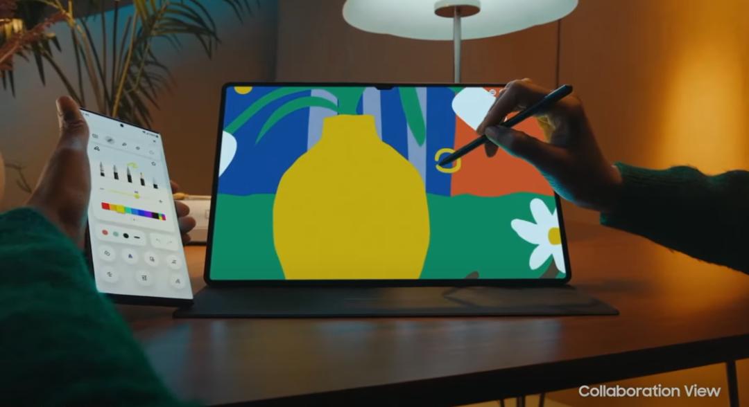 随着 Galaxy Tab S8 系列平板电脑的发布,三星在软件生态上也带来了新特性。在自家的 Galaxy Ecosystem 生态方面,现在你可以将 Galaxy S22 Ultra 当作调色板、将 Galaxy Tab S8 当作一块完整的画布,通过同一只 S Pen 联动两台独立的设备,在 Samsung Note 上完成创作。