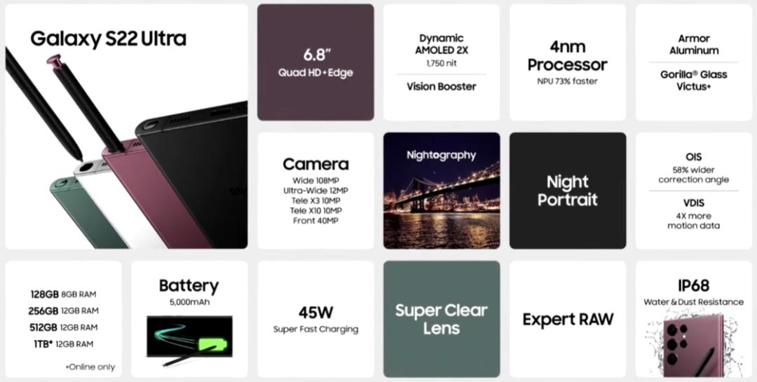 配色方面,Galaxy S22 Ultra 提供绯影红、雾松绿、羽梦白、曜夜黑四种配色,同时三星网上商城还会提供专属的远山灰、湖屿蓝以及蔷薇红配色。