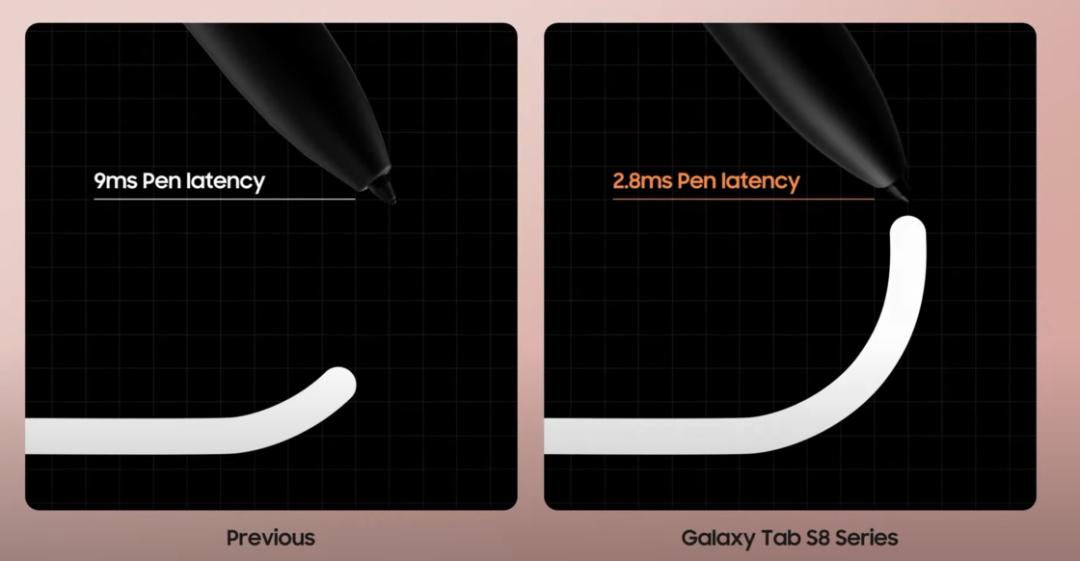 Galaxy Tab S8 系列也为 S Pen 带来了升级。优化后的 S Pen 降低了 30% 的延迟,最低延迟可达 2.8ms,结合 120Hz 的高刷屏,可以带来更加顺滑的手写笔体验。