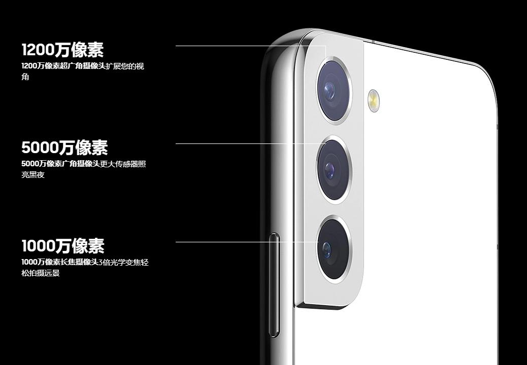 至于背面,Galaxy S22/S22+ 依然延续了 Galaxy S21 系列标志性的后置摄像头模组设计,并且采用了完全一致的多摄搭配方案,包括 50MP 的后置广角主摄、12MP 超广角、支持 3 倍光学变焦的 10MP 长焦、以及 10MP 的前置模组,其中主摄模组和长焦模组均支持 OIS 光学防抖。
