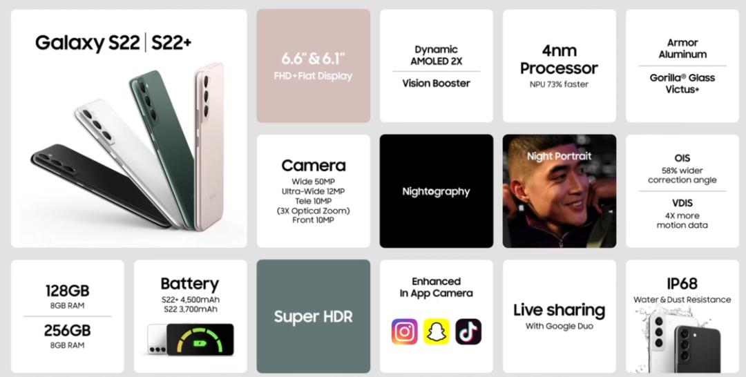 夜景拍摄方面也有不少亮点,三星为 S22 系列带来了全新的夜景拍摄模式 Nightography。由于这一代产品所使用的感光元件面积较上一代增加了 23%,并且三星还在后置摄像头中使用了带有「低反射纳米涂层」的超清玻璃镜头,能够有效减少暗光条件下的镜头炫光和反射(似乎在暗示什么)。除此之外,三星还为 Galaxy S22/S22+ 带来了 Super HDR,并且与 Snapchat、Instagram、TikTok 合作,使其能够在 App 内建相机中调用全新摄影系统的特性。