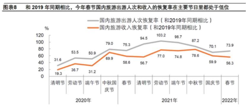 据文化和旅游部数据中心测算,2022年春节假期7天,全国国内旅游出游2.51亿人次,同比减少2.0%,恢复至2019年春节假日同期的73.9%;实现国内旅游收入2891.98亿元,同比减少3.9%,恢复至2019年春节假日同期的56.3%。对比2020年中秋国庆,这两个旅游数据的恢复率都处于较低水平。