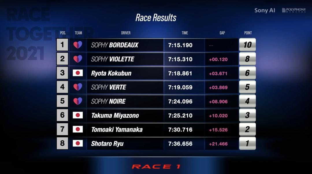比赛结果显示,排在前三的赛车选手,GT Sophy占据两席,只有人类选手国分凉太冲进了前三。
