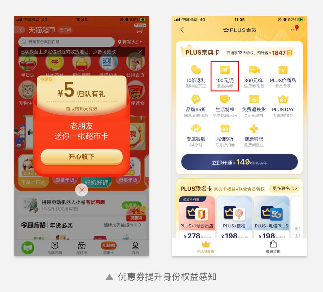 对于付费会员,一方面要提高优惠券本身的价值,与普通会员形成很大的差异,增强权益感知。