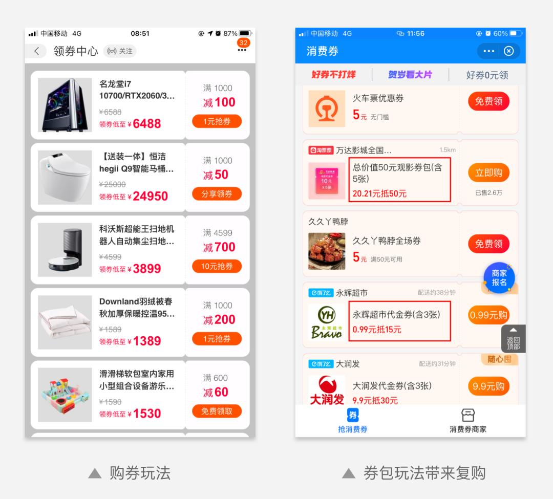 优惠券不是仅仅为了给用户让利,通过最低消费额度限制,可以更好的挖掘用户的消费需求,驱动用户购物。