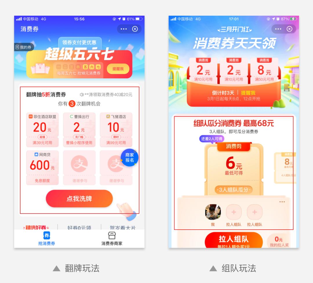 例如支付宝消费券频道先后推出了翻牌玩法、组队玩法。