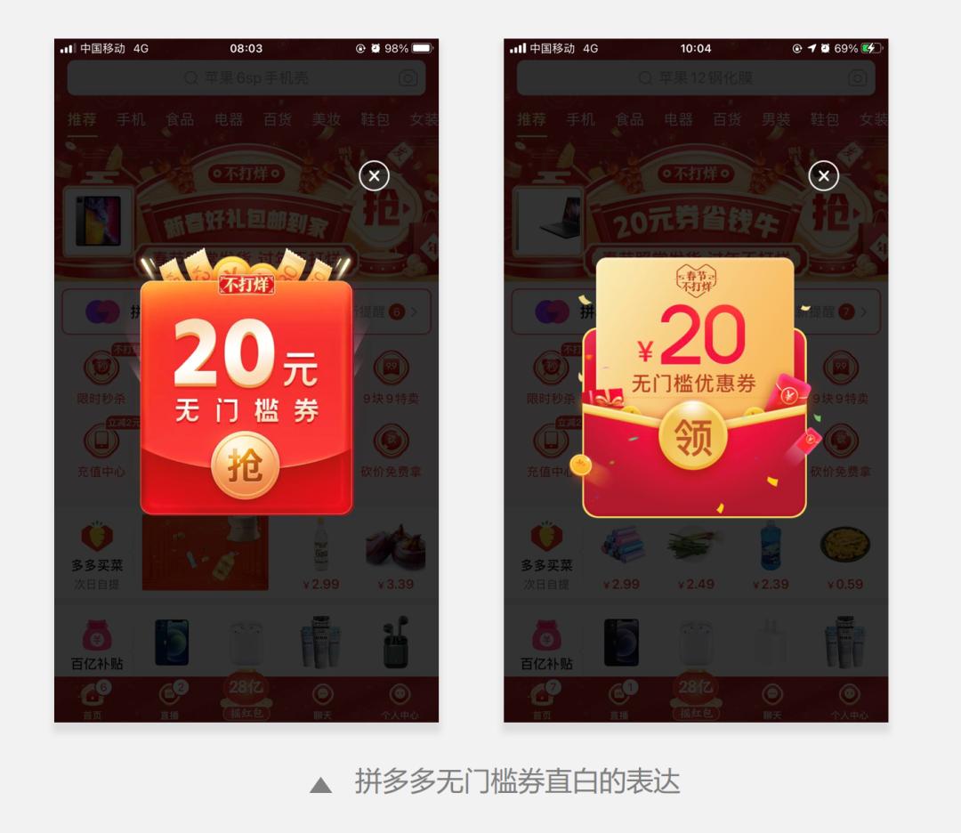 为了减少成本投入,无门槛券一般额度比较小,拼多多和苏宁推出了20元大额无门槛券。