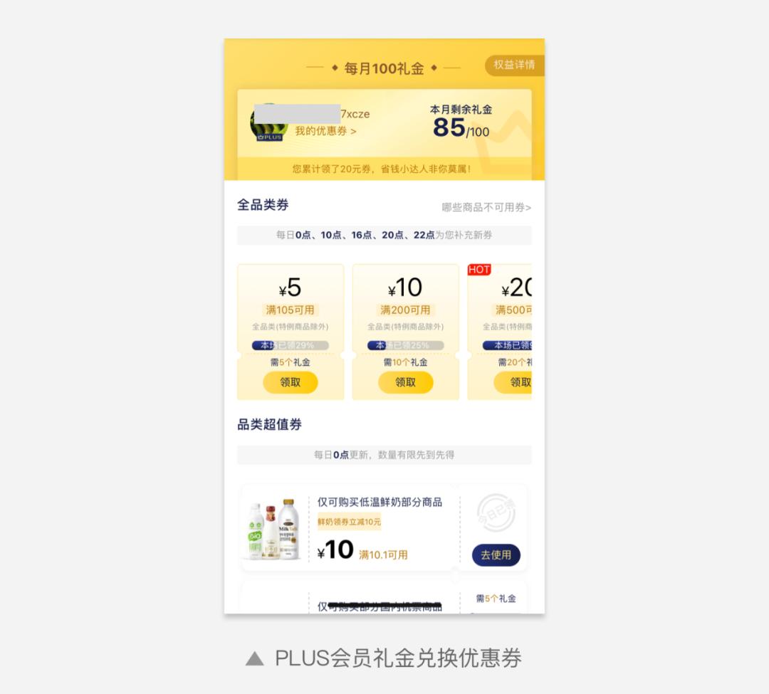 例如新人专属券、沉睡用户的回归礼包等等,同样优惠券也成为了电商付费会员重要的专属权益。