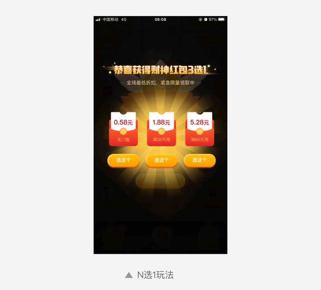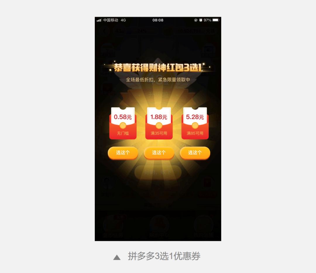 例如拼多多多多赚大钱游戏中植入了拼单任务,配合每日出现的3选1优惠券,更好的激励用户下单。