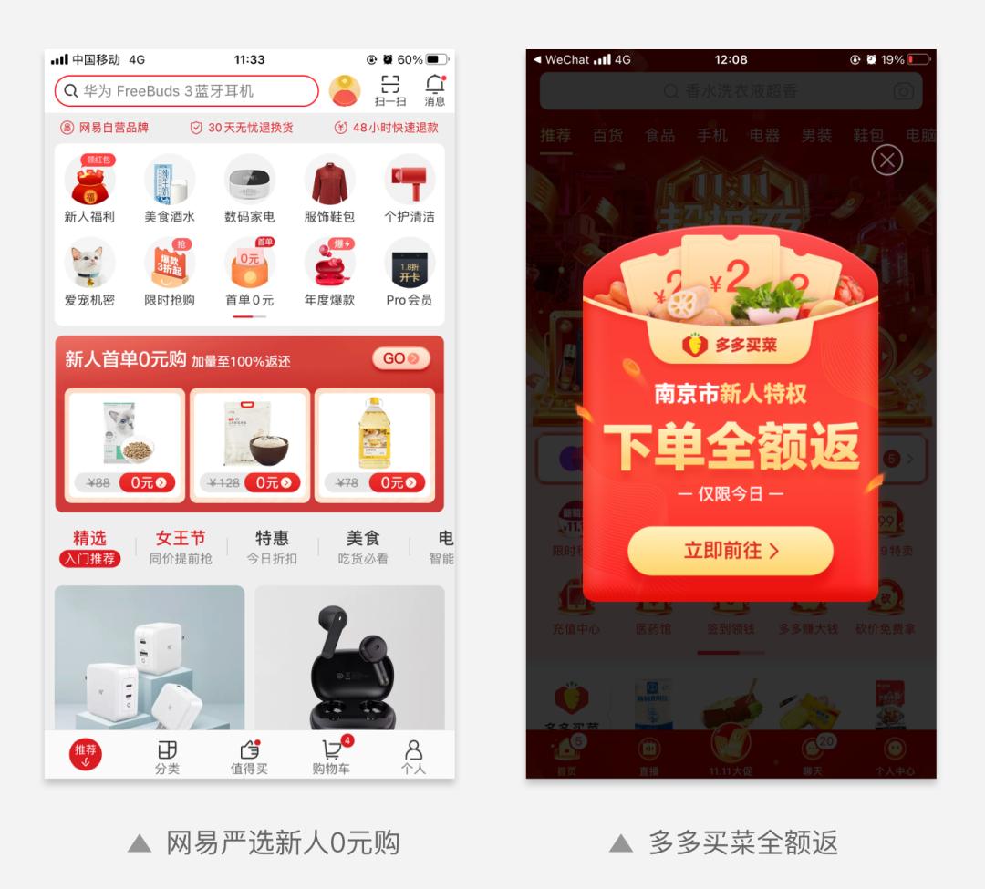 例如网易严选推出的“新人首单0元购”活动,实际的玩法是用户消费金额下单后,返还同样金额的2张优惠券。