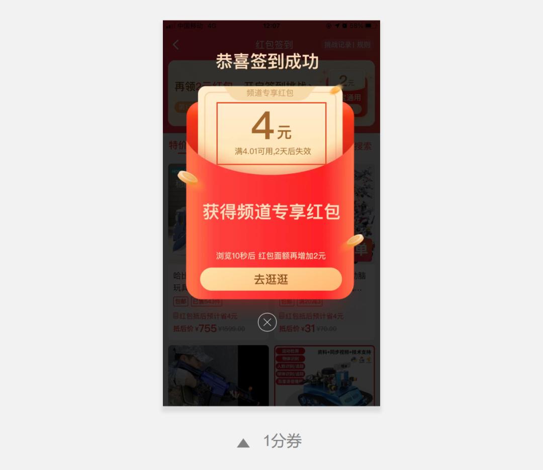 例如淘宝签到频道以通用券作为利益点,既吸引了用户签到,又通过底部商品曝光,增加了用户与商品的触点,激发用户的购物欲望,为用户获得优惠券奖励后的快速转化做好准备。