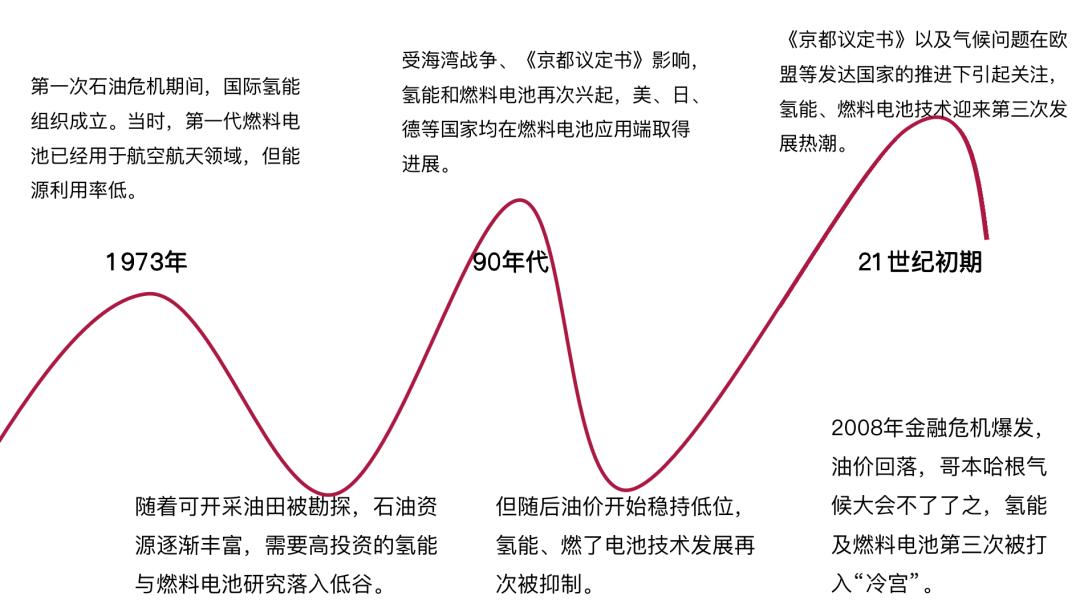 2. 接轨世界:上世纪70年代以后,中国氢能发展开始受到国际大环境的影响,而国际氢能环境又受到石油价格的影响,因此经历了“三起三落”:分别发生在1973年、90年代两次石油危机后,以及21世纪初期《京都议定书》签订和金融危机时。