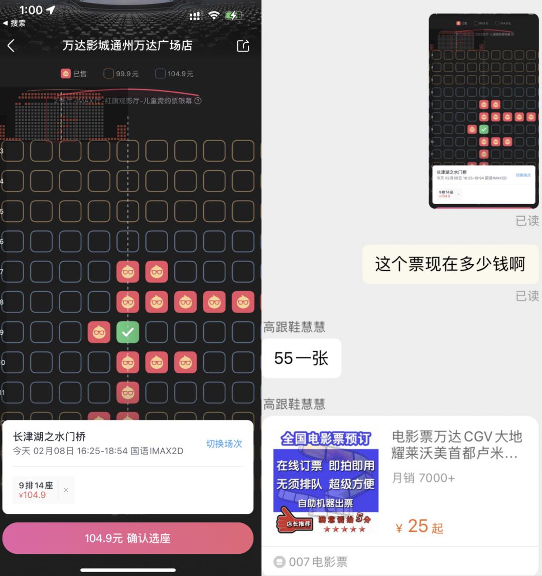 在「史上最贵春节档」之后的第二个开工日,你可以从淘宝的黄牛手里,以55元左右的价格,买到《长津湖之水门桥》在北京通州万达IMAX影厅的黄金位置电影票,在票务平台上,这张电影票的价格则仍然高达104.9元。