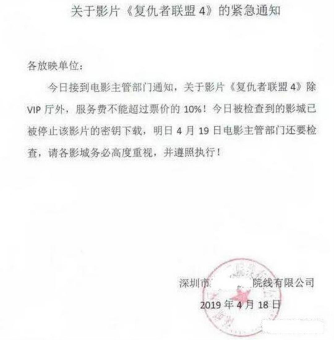 2019年4月的《复仇者联盟4》作为超级爆款,吸引了大量影迷,不少影院一度因为狂热的市场需求无节制地提升服务费的比例,部分地区出现了价格高达500元的电影票,由于服务费不参与分账,给影院带来了巨大的利润,同时直接影响片方收入。以至于有关部门迅速出台政策限制,除VIP厅可加收10%服务费外,其他影厅不得超额加收。