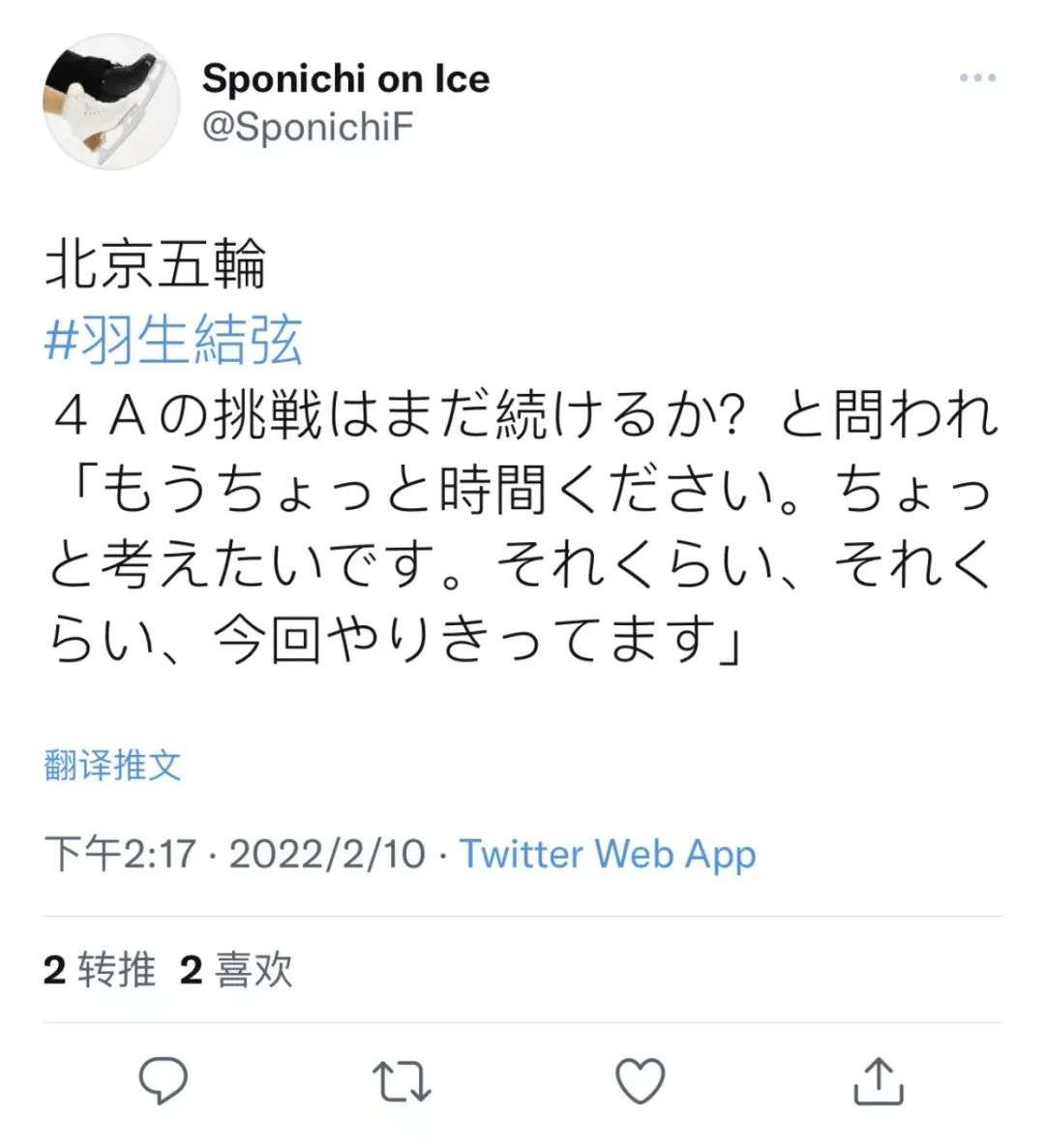 在被问到“之后还会继续挑战4A吗”的时候,羽生结弦表示,“再给我一点时间,我再考虑一下。”
