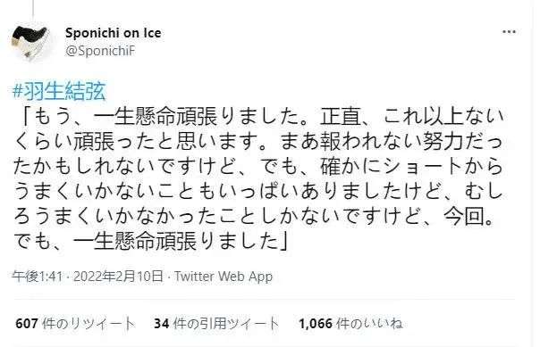 在赛后的采访中羽生结弦说:“我已经拼尽全力了。老实说,已经不能更努力了。也许这份努力没有获得相应的回报,从短节目开始就有很多不顺之处。但是真的已经拼尽全力了。”