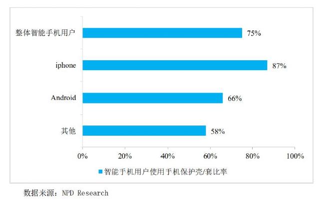 再看看另一份数据显示,智能手机用户使用保护壳的比率中,iPhone用户一骑绝尘,高达87%,而安卓机的手机壳使用率仅仅66%。