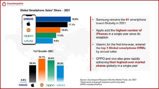 根据调研机构Counterpoint Research的数据显示,2021年,苹果手机在全球智能手机市场上的占有率达到了17.2%,排在第二位。