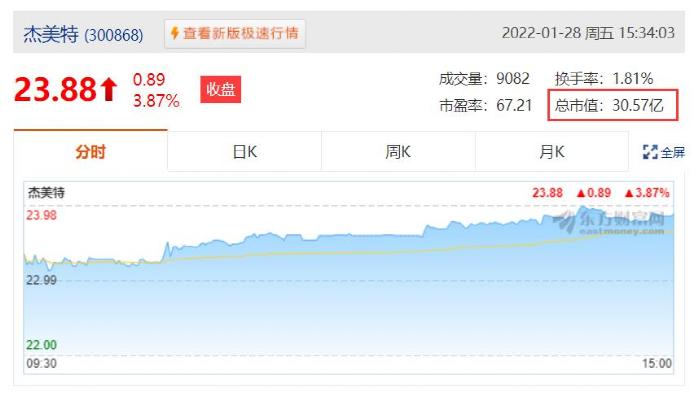 杰美特是2020年8月24日,在深交所创业板成功上市,上市首日,总市值高达96.35亿元。而如今,根据最新数据显示,其总市值为30.57亿元。