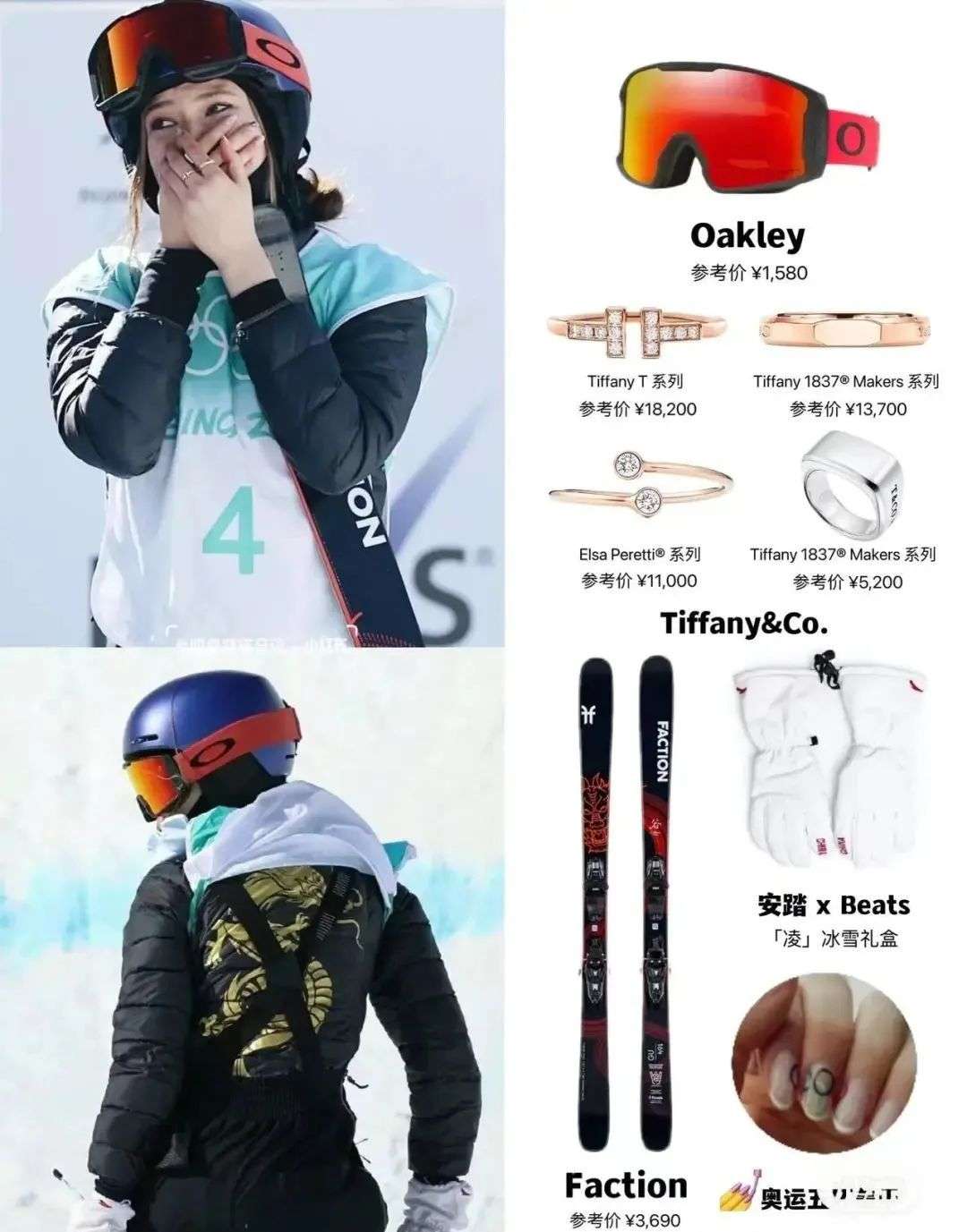 2月8日谷爱凌夺得自由式滑雪女子大跳台冠军后,很快就有博主扒出了她参赛时使用的滑雪板和雪镜、佩戴的同款戒指和手套,就连“谷爱凌五环美甲”,也很快登上微博热搜。至2月10日,小红书“谷爱凌同款”笔记已经近2000篇。