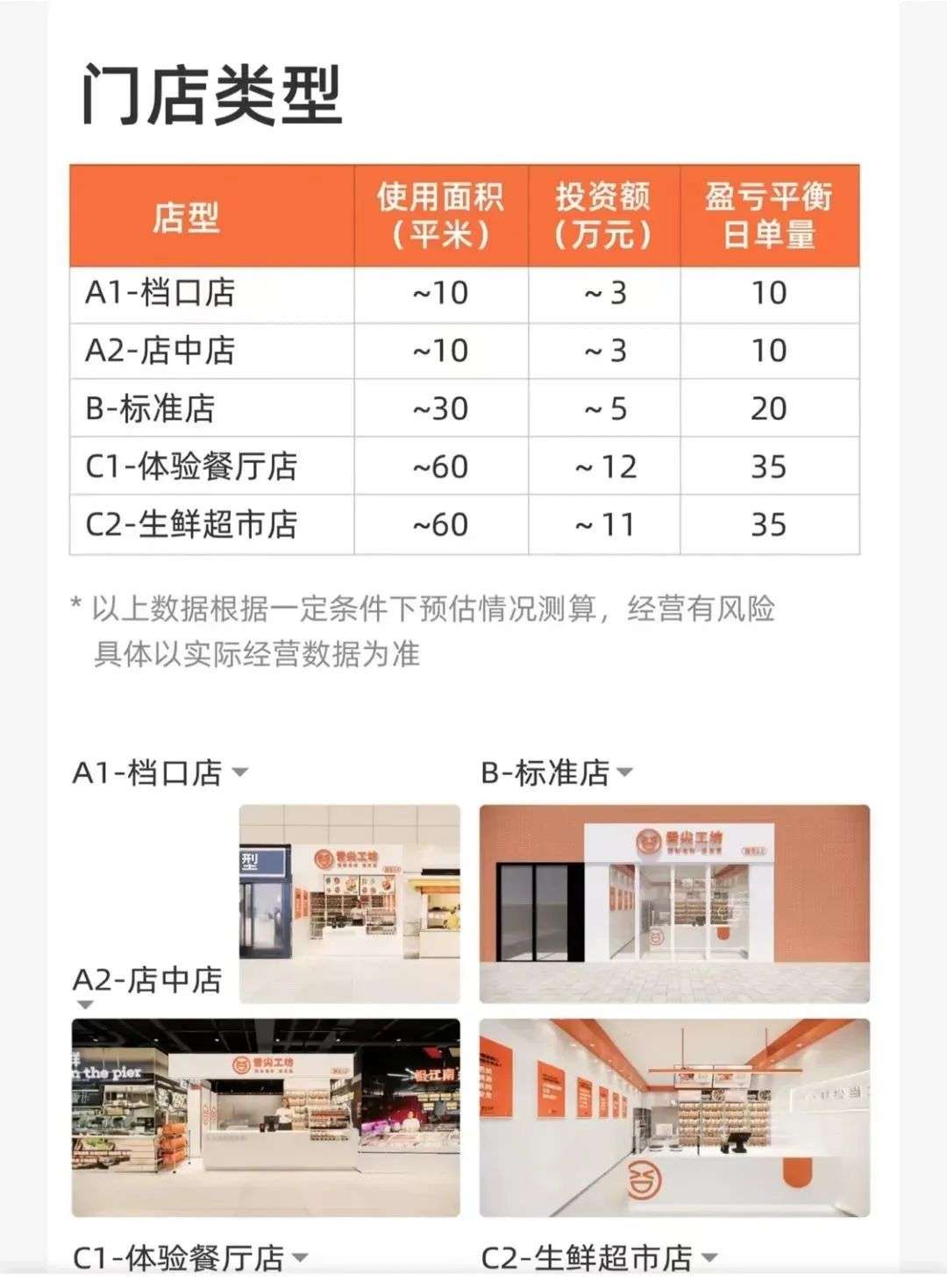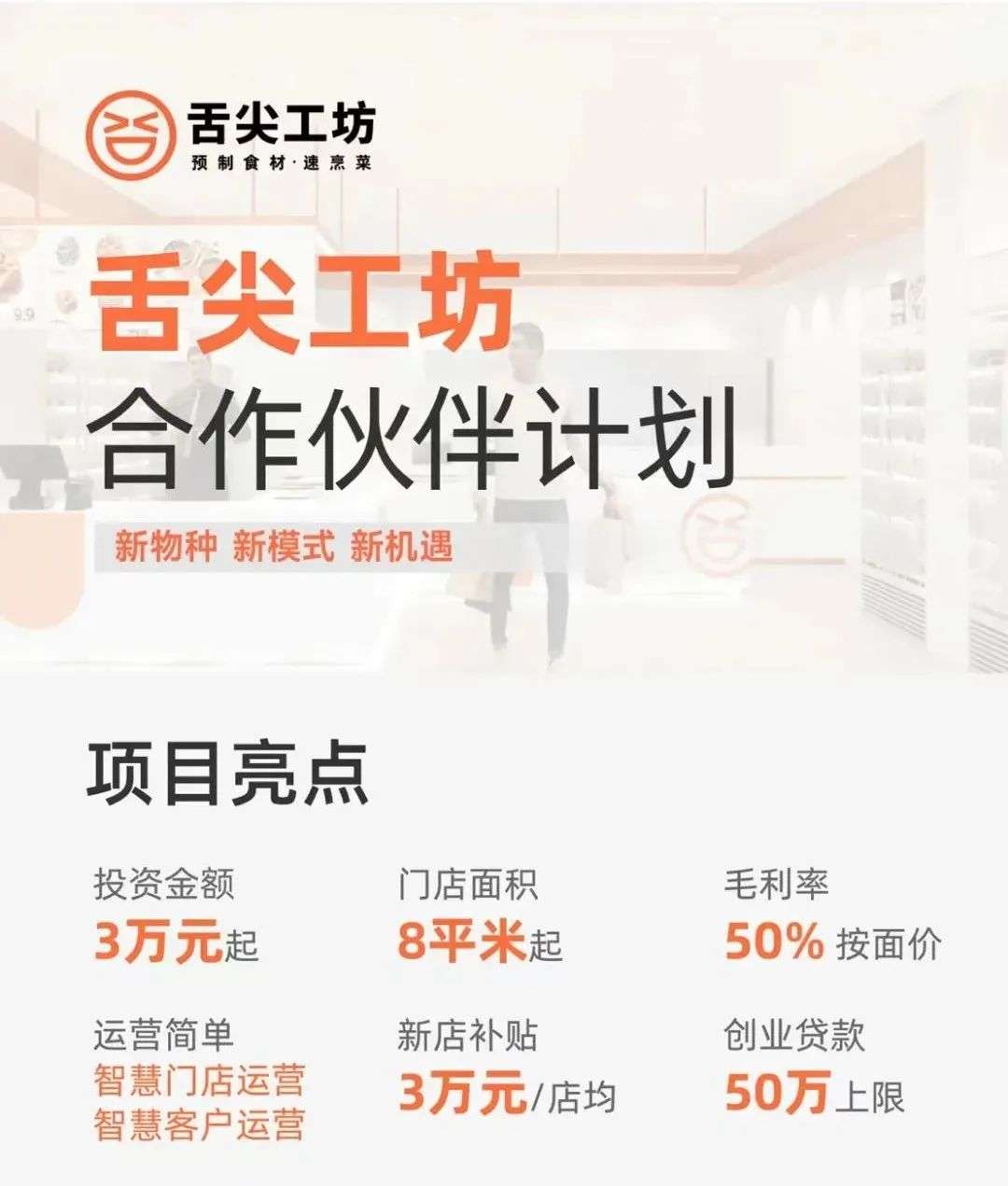据“舌尖工坊”合作伙伴计划宣称,其项目投资金额3万元起,门店面积8平方米起,毛利率50%(按面价)。新店补贴3万元/店均,创业贷款50万上限。在页面中,还展示了预制菜行业的预测、产品优势、不同店型、推广期优惠政策等。