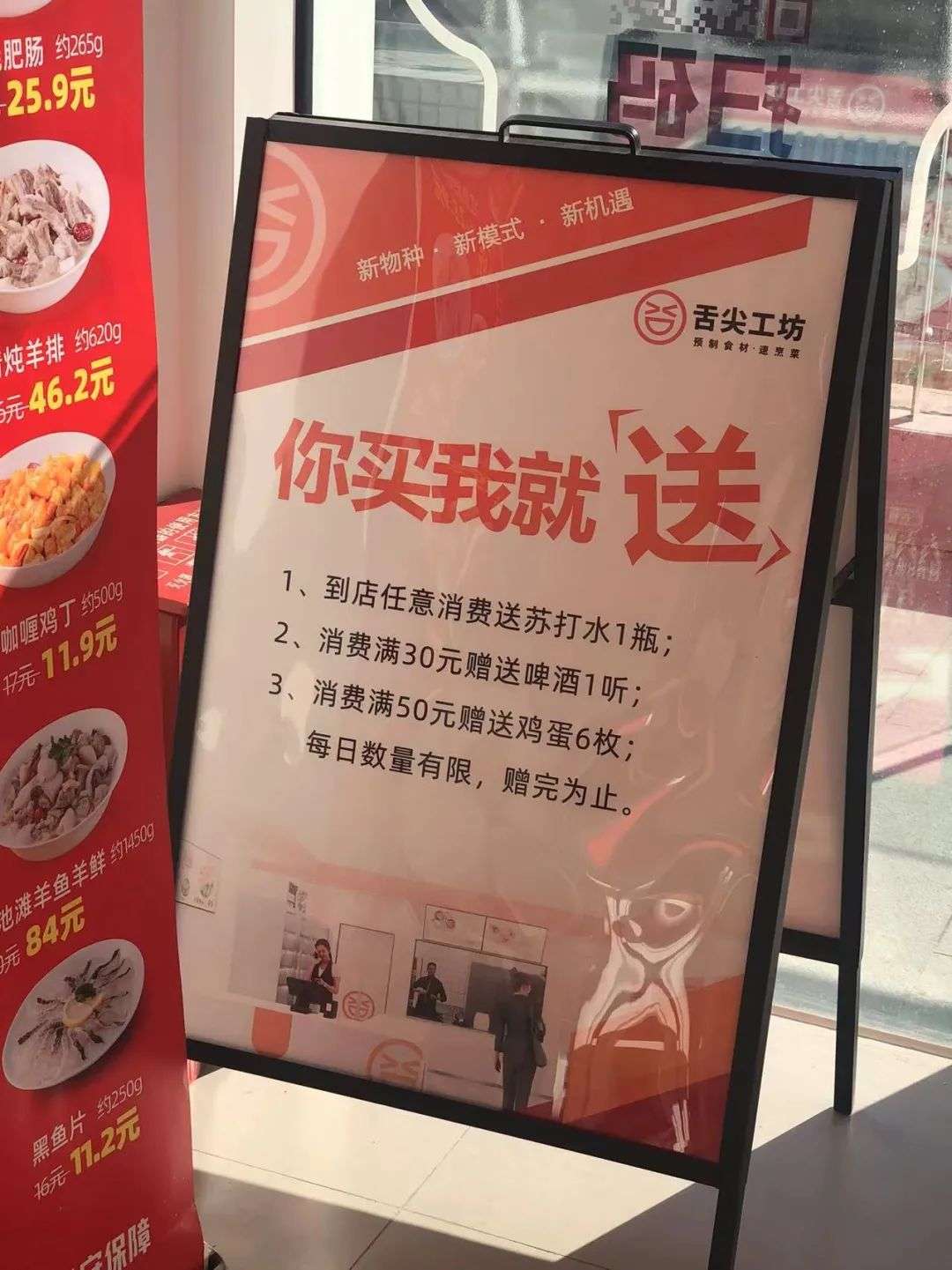这一品类设置使“舌尖工坊”看上去不太像预制菜专门店,而更像是以预制菜为特色的线下食材超市。同时,在舌尖工坊网站的宣传图中,超市3.0的字样也出现在了招牌上。从此类操作来看又与锅圈食汇非常相似。