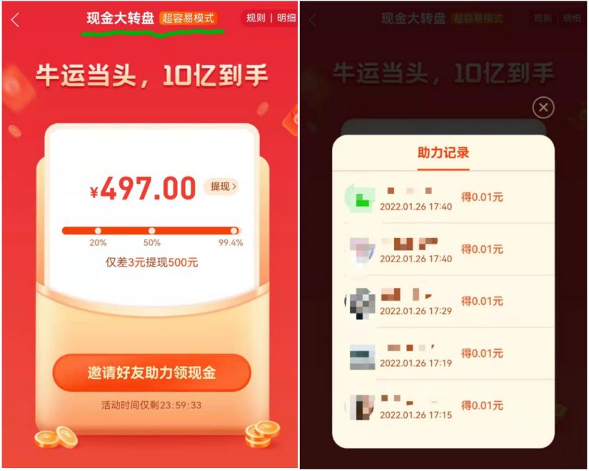 简单来说,用户点击活动入口进入,系统会直接发放一定数额的现金红包,红包金额设定在100元-800元之间不等的非整数,比如497、799,玩家需要不断邀请好用助力,凑够500、800等系统指定的整数,则能将对应现金提现到微信。