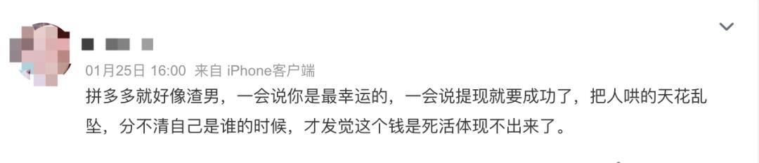 另一位拼多多现金提现“受害者”告诉新浪科技,自己意识到这是个无底洞后——没有几百人助力提不出来,便果断退出及时止损了。