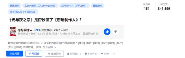同时,前者深陷抄袭事件,知乎上有关光夜抄袭恋与的问题,其浏览度破30w,共有近8000人做出评价。