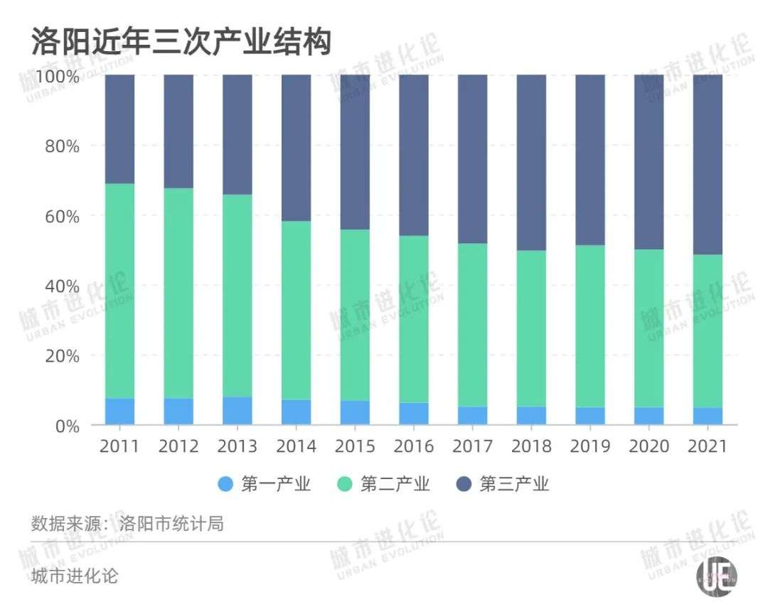 这与洛阳工业动能不足不无干系。从规上工业增速来看,洛阳仅为1.8%,而榆林和襄阳分别为9.3%和20.3%。近10年中,洛阳第二产业占比从61.3%下降至43.7%,并且在2017年产业结构实现从“二三一”向“三二一”的转变,并且三产比重有继续提升的趋势。