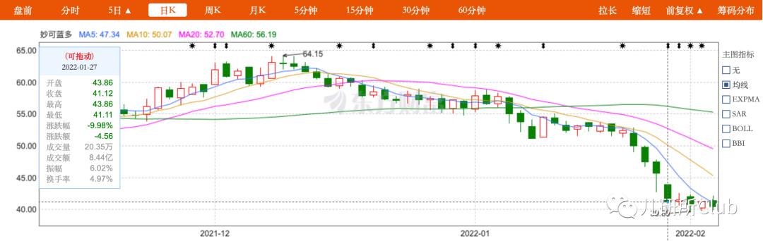 虽业绩预喜,但妙可蓝多难以扭转股价跌势。1月27日开盘之后,股价应声大跌,盘中一度触及跌停,最终以9.98%的跌幅收盘。这已经是其连续第4个交易日大幅回调。自21年12月9日以来,妙可蓝多股价一路向下,累计跌幅已超过35%。