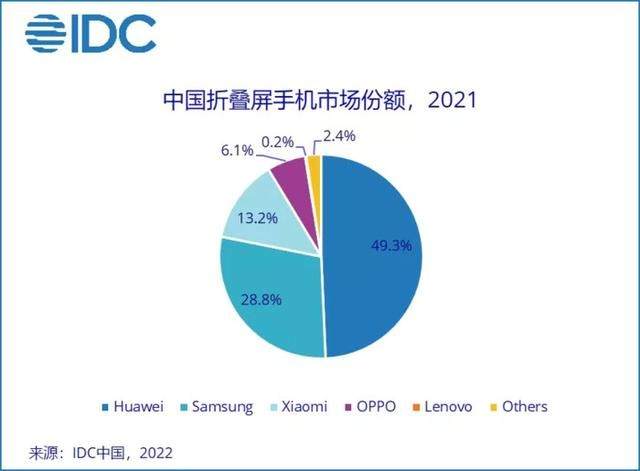 据IDC最新的报告数据显示,2021年全年中国智能手机市场出货量约3.29亿台,同比微涨1.1%,市场已经趋近饱和。在这其中,折叠屏手机的出货量约为150万台,仅在国内智能机市场中占比0.5%,还属于极其小众的品类。