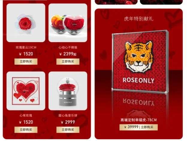 从价格来看,主营永生花产品的品牌普遍走的是中高端路线,对标一二线市场的消费者,并主要以礼盒的形式销售。以永生花品牌Roseonly为例,其永生花甜心兔公仔玫瑰花礼盒售价1520元,情人节甄选玫瑰系列的售价则介于1520~19999元之间,而“虎年高端定制幸福虎”永生玫瑰花甚至标出了39999元的天价。