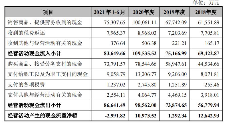作为一个代工企业,如果要进一步扩大生产规模,提升技术及研发实力,实现机械生产向智能生产的转型,则需要持续加大资金投入,从而造成现金流危机。招股书显示,2018-2021年上半年,比依股份的经营现金流分别为1.26亿元、1292.34万元、1.10亿元、-2991.84万元。