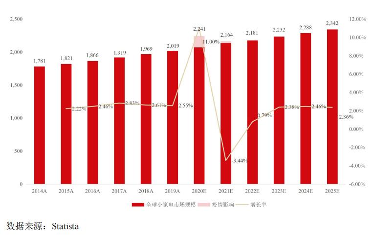 新冠疫情期间宅经济和健康理念的普及也为空气炸锅等厨房小家电爆发提供了一个契机。根据Statista 数据库的数据,全球小家电2012-2019 年度复合增长率约为 2.73%,而受到居家时长的影响,2020 年厨房小家电收入总额增长了17.82%。