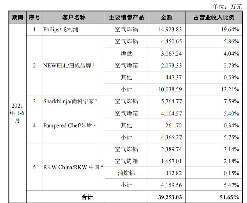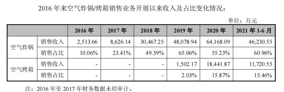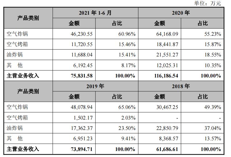 据公开信息,比依股份是一家以空气炸锅、空气烤箱、油炸锅、煎烤器等加热类厨房小家电产品的设计、制造和销售为核心业务的高新技术企业。数据显示,2020年,比依股份依靠空气炸锅卖出6个多亿;2021年上半年,空气炸锅在比依股份中的销售占比也高达60%,正是凭借“网红”产品空气炸锅的热卖,比依股份才有机会登陆上交所主板。