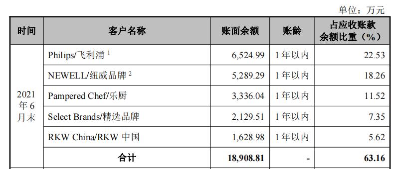 第二,过高依赖大客户及海外市场。招股书显示,2021年1月-6月,Philips/飞利浦、NEWELL/纽威品牌、SharkNinja/尚科宁家、Pampered Chef/乐厨、RKW China/RKW 中国为其前五大客户,占总营收比例的51.65%。而在2018年、2019年、2020年,这一数字分别为40.48%、42.68%、46.61%。比依股份对于大客户的依赖程度逐渐提升,从而使其在市场博弈中处于不利境地。招股书显示,2018年、2019年、2020年、2021年1月-6月,比依股份的应收款项余额分别为6848万元、1.35亿元、2.99亿元以及2.89亿元,占营业收入的比例分别为11.07%、18.27%、25.74%和 38.12%,虽说外企的信用情况良好,但未来也有可能形成坏账。