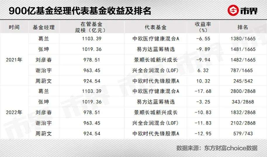 截至2021年末,管理资产规模超过900亿元的主动型管理基金经理共有5位,分别为葛兰、张坤、刘彦春、谢治宇和周蔚文。其中,葛兰、张坤、刘彦春三人2021年收益率告负,5位基金经理2022年收益率全部为负,除张坤外,其他4人代表基金排名均靠后。