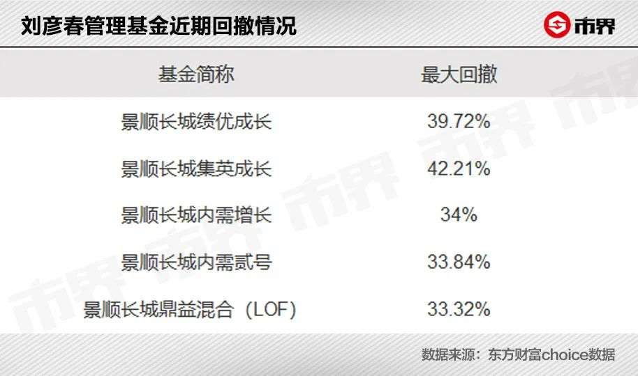 2021年2月10日是刘彦春的分水岭,从这一天开始,他管理的基金全部回撤,且有5只基金为成立以来的最大回撤,景顺长城新兴成长回撤也超过30%。