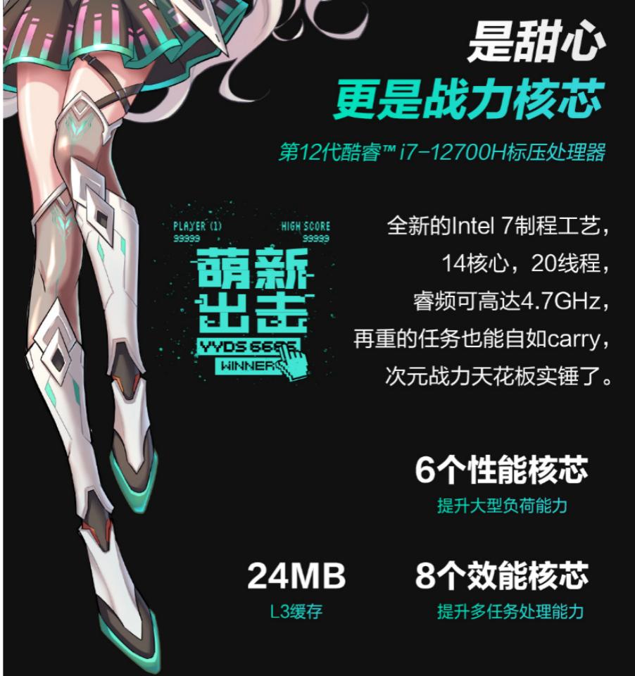 l 搭载12代酷睿i7-12700H处理器,6性能核8能效核,20线程,24MB缓存;