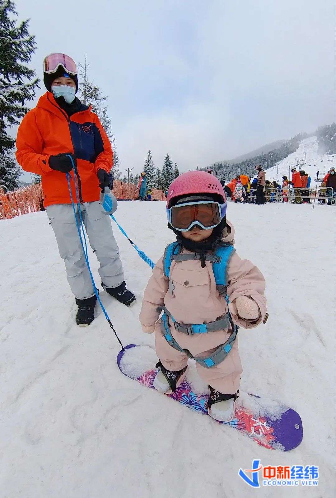 ▲许梦奇带着女儿练习滑雪
