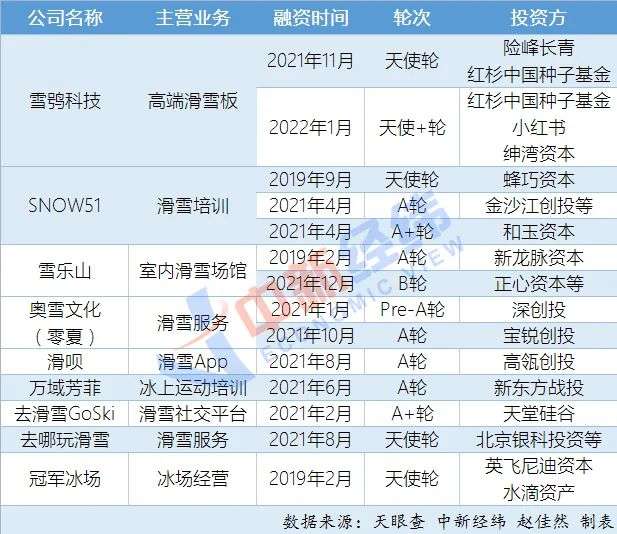 天眼查数据显示,滑雪培训机构SNOW51曾在2021年先后连获A及A+轮亿元融资,其中A轮由金沙江创投领投,A+轮融资由和玉资本投资;此外,室内模拟滑雪连锁机构雪乐山滑雪于2021年12月获得1亿元战略投资;主营高端滑雪板的雪鸮科技在2021年11月、2022年1月接连融资,投资方包括红杉中国种子基金、小红书等。