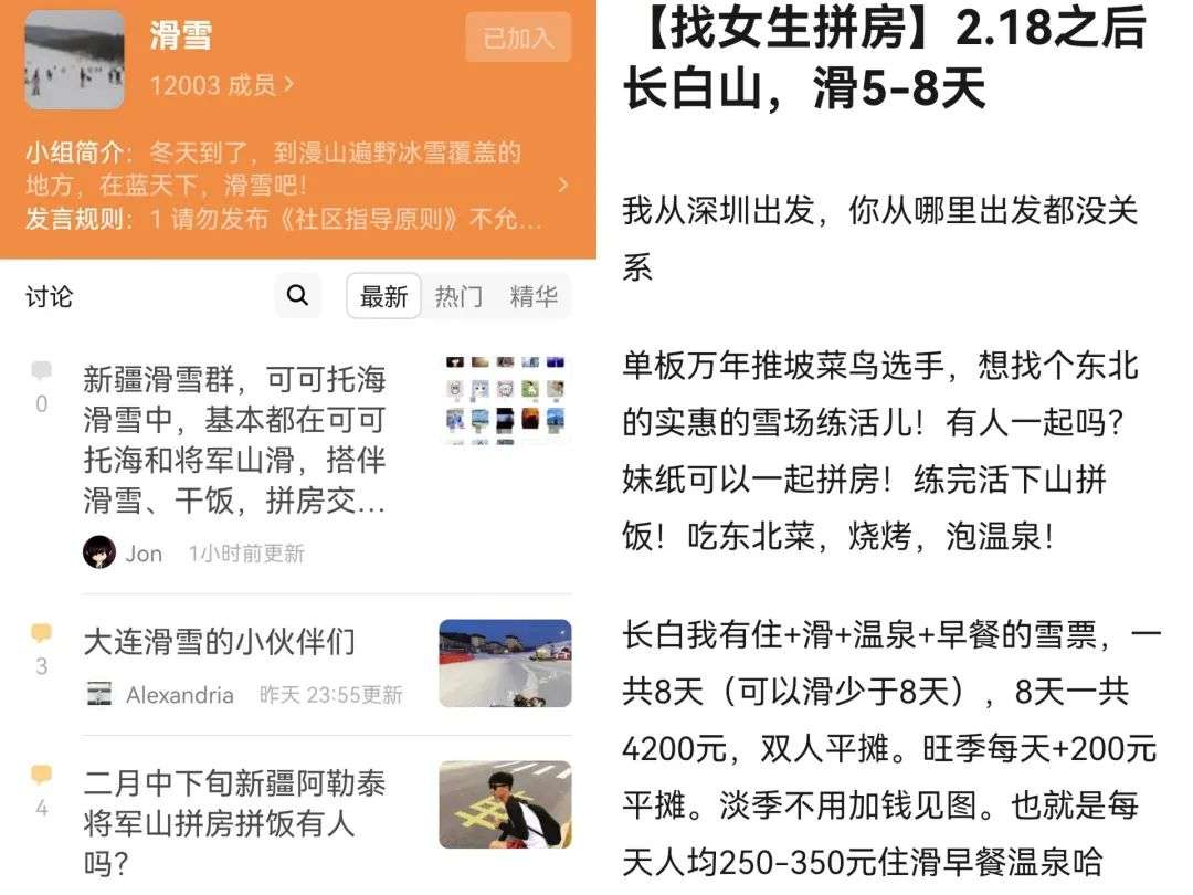 豆瓣上的几个滑雪兴趣小组每天也有不少拼团的帖子:“有2月底去长白山滑雪拼房的朋友吗”,“3.12到3.20可可托海找队友拼房”,“上海到将军山有没有雪友拼车拼房”……