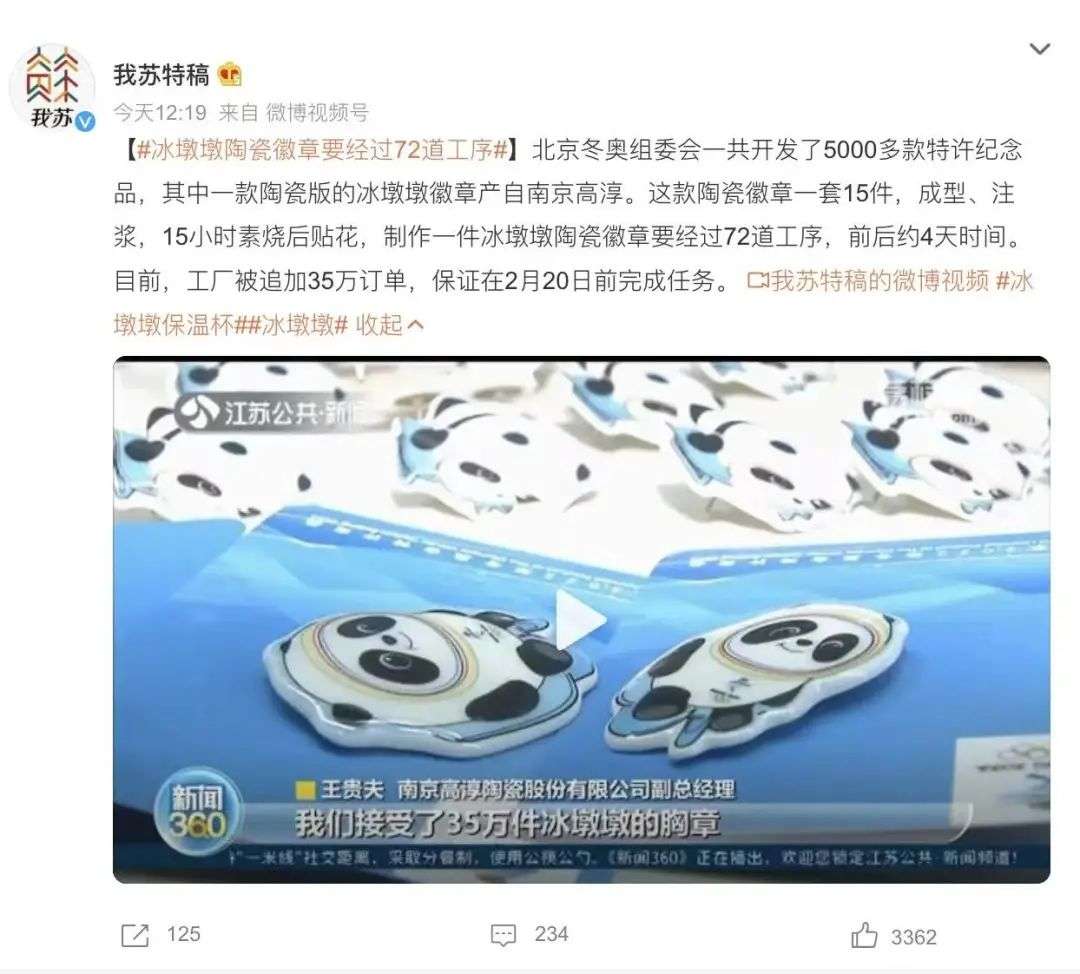 另外这两年现象级的一些爆款产品最初都很「稀缺」,有点饥饿营销+从众心理的意思。只是我觉得冰墩墩的商业潜力最初也被低估了,现在的产业带显得有点应接不暇,从这一点可以看出,这个产品初期可能没预估到会这么受欢迎。这给我们所有做品牌衍生品的一个启发是,可能什么方法都不如踏踏实实的完善自己的产品设计与设计理念,到时候才能接住。